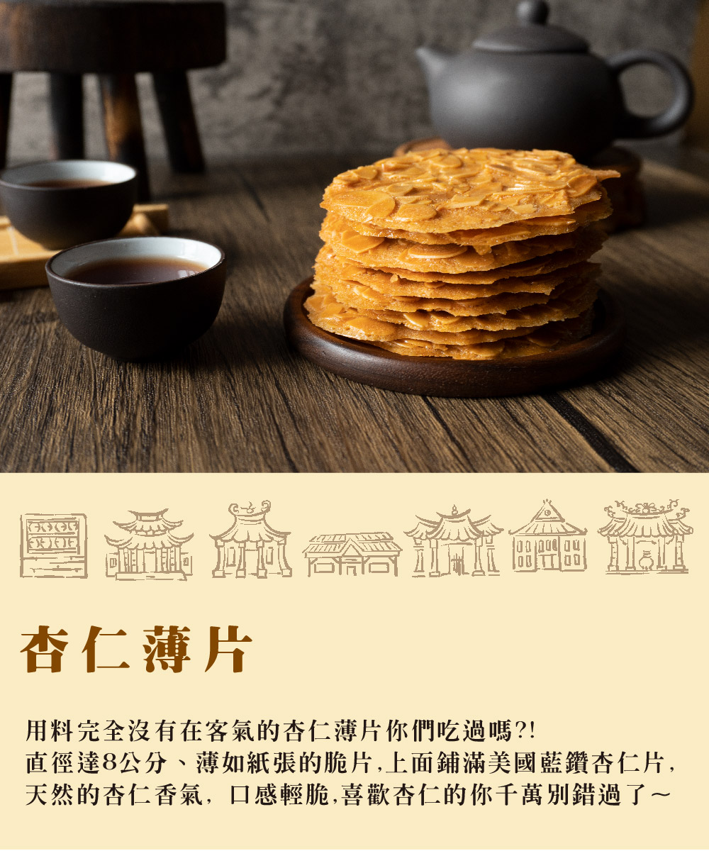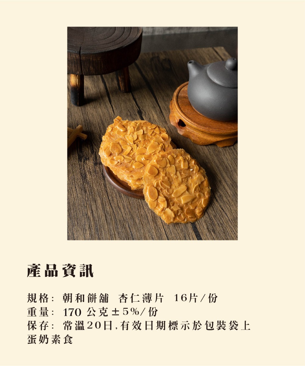 產品介紹 PRODUCT 首頁 › 產品介紹 › 古早味茶點系列 › 杏仁薄片 (蛋奶素) 產品分類 全部商品 朝和招牌餅系列 古早味茶點系列 朝選漢式餅系列 糕點小零嘴系列 全部商品 朝和招牌餅系列 古早味茶點系列 朝選漢式餅系列 糕點小零嘴系列 古早味茶點系列 杏仁薄片 (蛋奶素) NT $ 340 test.tsao-her.com.tw Almond Tulies アーモンドクッキー 아몬드 튀일 選擇規格 15包/禮盒 (含提袋) 8包/袋 選擇數量 -+ 加入購物車 下載訂購單 2025朝和餅舖訂購單(1).doc 商品詳細說明 ← 回上頁