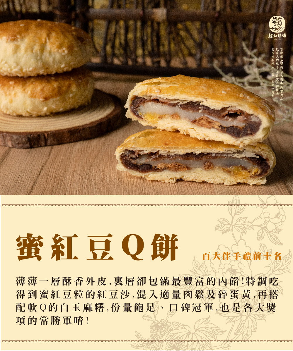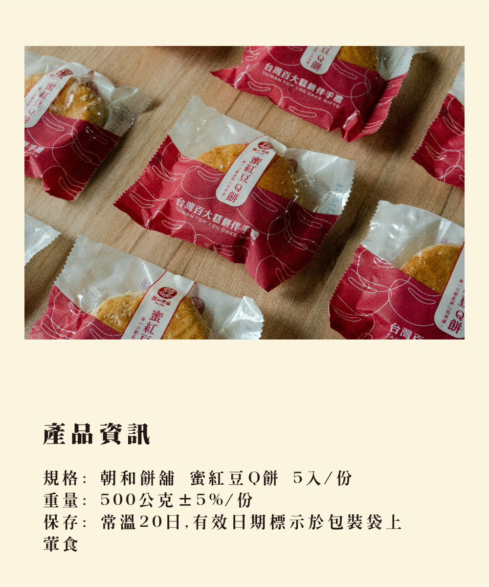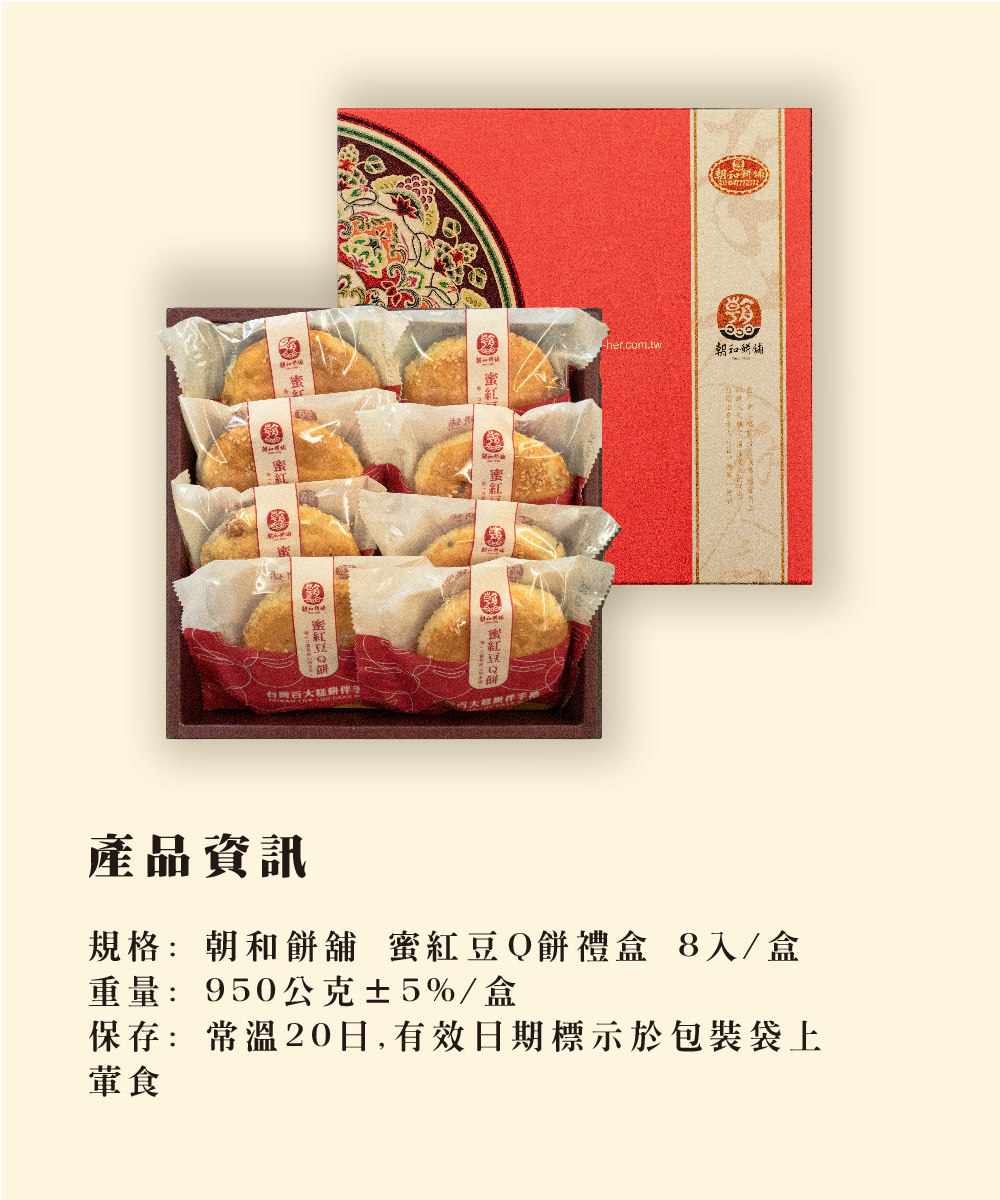 產品介紹 PRODUCT 首頁 › 產品介紹 › 朝和招牌餅系列 › 蜜紅豆Q餅 (葷食) 產品分類 全部商品 朝和招牌餅系列 古早味茶點系列 朝選漢式餅系列 糕點小零嘴系列 全部商品 朝和招牌餅系列 古早味茶點系列 朝選漢式餅系列 糕點小零嘴系列 朝和招牌餅系列 蜜紅豆Q餅 (葷食) NT $ 250 test.tsao-her.com.tw Red Bean Q Cake With Pork Floss 豚肉でんぶ入りこし餡Q餅 러우쏭 팥앙금 찰쌀케이크 選擇規格 5入/輕便包 選擇數量 -+ 加入購物車 下載訂購單 2025朝和餅舖訂購單(1).doc 商品詳細說明 ← 回上頁