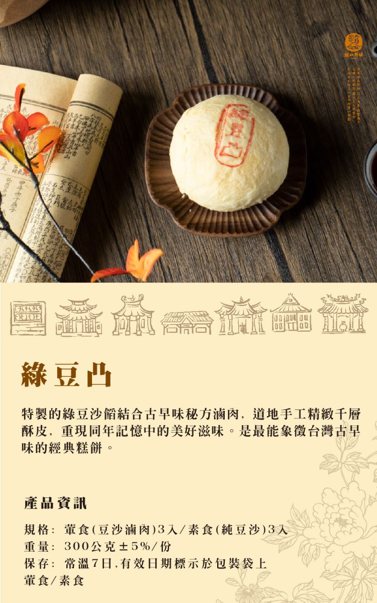 產品介紹 PRODUCT 首頁 › 產品介紹 › 古早味茶點系列 › 綠豆凸 (葷食/素食) 產品分類 全部商品 朝和招牌餅系列 古早味茶點系列 朝選漢式餅系列 糕點小零嘴系列 全部商品 朝和招牌餅系列 古早味茶點系列 朝選漢式餅系列 糕點小零嘴系列 古早味茶點系列 綠豆凸 (葷食/素食) NT $ 130 test.tsao-her.com.tw Mung Bean Pastry With Pork 豚肉入り緑豆餡餅 고기 녹두만주 選擇規格 葷食3入/份 素食3入/份 選擇數量 -+ 加入購物車 下載訂購單 2025朝和餅舖訂購單(1).doc 商品詳細說明 ← 回上頁