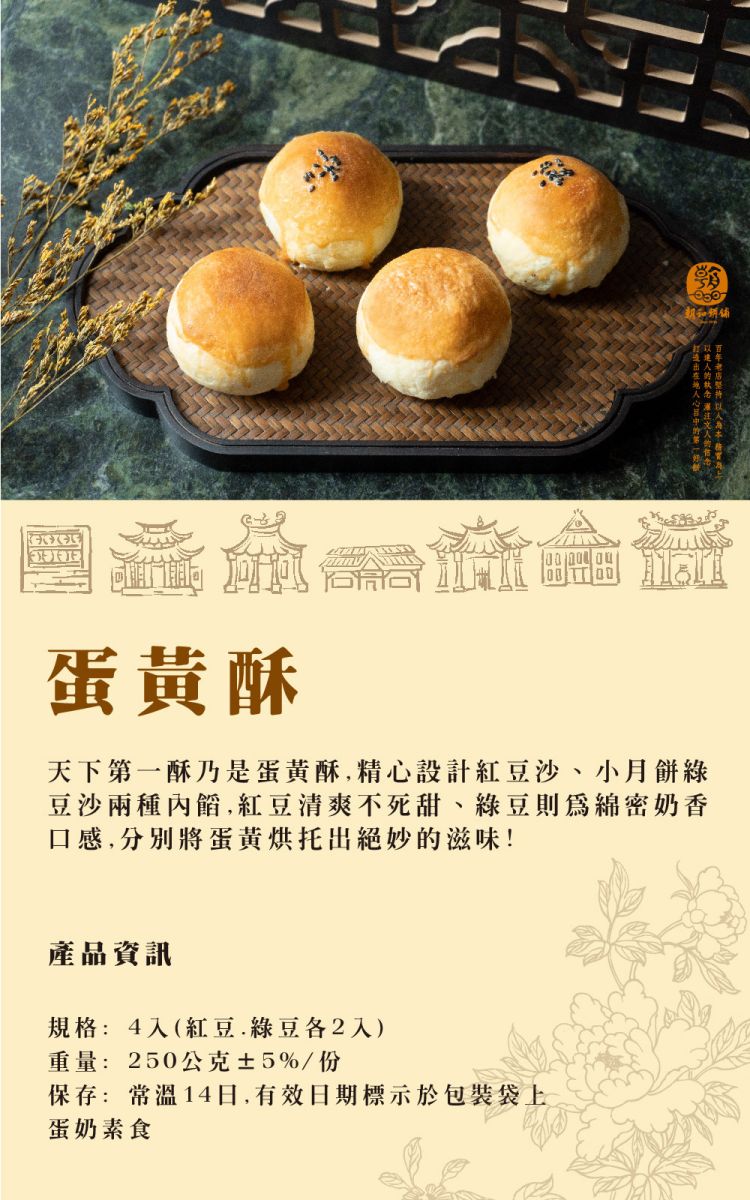 產品介紹 PRODUCT 首頁 › 產品介紹 › 古早味茶點系列 › 蛋黃酥 (蛋奶素) 產品分類 全部商品 朝和招牌餅系列 古早味茶點系列 朝選漢式餅系列 糕點小零嘴系列 全部商品 朝和招牌餅系列 古早味茶點系列 朝選漢式餅系列 糕點小零嘴系列 古早味茶點系列 蛋黃酥 (蛋奶素) NT $ 180 test.tsao-her.com.tw Red/Mung Bean Yolk Cake タンファンスー 단황수(팥소/콩소) 選擇規格 4入/份 選擇數量 -+ 加入購物車 下載訂購單 2025朝和餅舖訂購單(1).doc 商品詳細說明 ← 回上頁