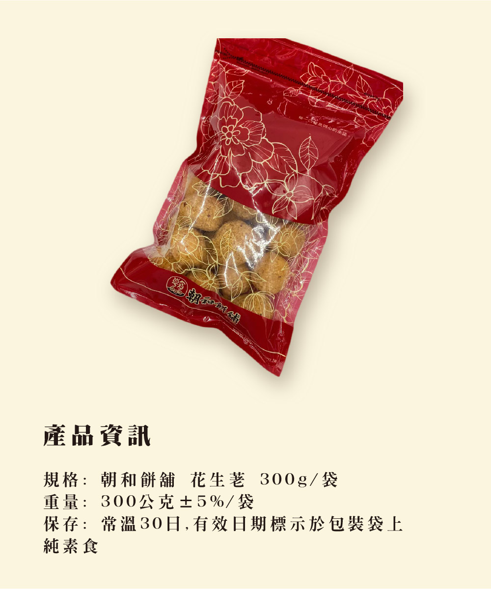 產品介紹 PRODUCT 首頁 › 產品介紹 › 古早味茶點系列 › 花生粩 (全素) 產品分類 全部商品 朝和招牌餅系列 古早味茶點系列 朝選漢式餅系列 糕點小零嘴系列 全部商品 朝和招牌餅系列 古早味茶點系列 朝選漢式餅系列 糕點小零嘴系列 古早味茶點系列 花生粩 (全素) NT $ 130 test.tsao-her.com.tw Taiwanese Peanut Powder Puff ピーナッツ マーラオ 땅콩가루과자 選擇規格 300g /份 選擇數量 -+ 加入購物車 下載訂購單 2025朝和餅舖訂購單(1).doc 商品詳細說明 ← 回上頁