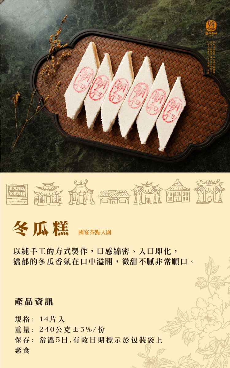 產品介紹 PRODUCT 首頁 › 產品介紹 › 糕點小零嘴系列 › 冬瓜糕 (全素) 產品分類 全部商品 朝和招牌餅系列 古早味茶點系列 朝選漢式餅系列 糕點小零嘴系列 全部商品 朝和招牌餅系列 古早味茶點系列 朝選漢式餅系列 糕點小零嘴系列 糕點小零嘴系列 冬瓜糕 (全素) NT $ 100 test.tsao-her.com.tw Winter Melon Cake 冬瓜落雁 동과고(쌀가루과자) 選擇規格 14片入/盒 選擇數量 -+ 加入購物車 下載訂購單 2025朝和餅舖訂購單(1).doc 商品詳細說明 ← 回上頁