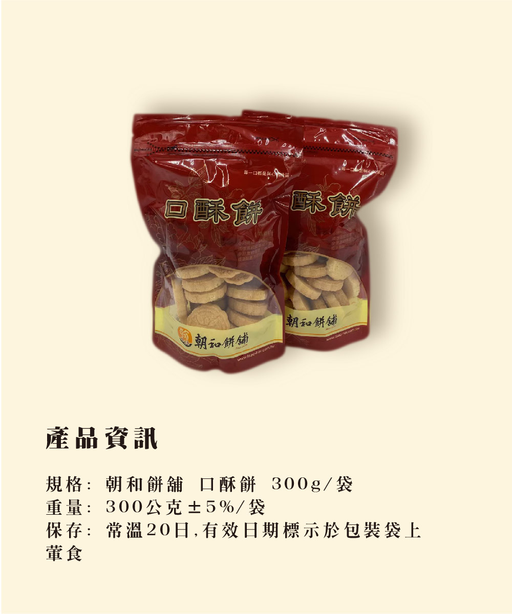 產品介紹 PRODUCT 首頁 › 產品介紹 › 古早味茶點系列 › 口酥餅 (葷食) 產品分類 全部商品 朝和招牌餅系列 古早味茶點系列 朝選漢式餅系列 糕點小零嘴系列 全部商品 朝和招牌餅系列 古早味茶點系列 朝選漢式餅系列 糕點小零嘴系列 古早味茶點系列 口酥餅 (葷食) NT $ 130 test.tsao-her.com.tw Crunchy Cookies 台湾のバタークッキー 대만식 버터쿠키 選擇規格 300g/袋 選擇數量 -+ 加入購物車 下載訂購單 2025朝和餅舖訂購單(1).doc 商品詳細說明 ← 回上頁
