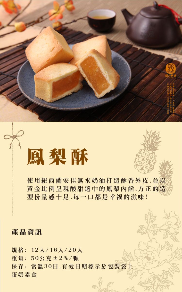 產品介紹 PRODUCT 首頁 › 產品介紹 › 朝和招牌餅系列 › 鳳梨酥 (蛋奶素) 產品分類 全部商品 朝和招牌餅系列 古早味茶點系列 朝選漢式餅系列 糕點小零嘴系列 全部商品 朝和招牌餅系列 古早味茶點系列 朝選漢式餅系列 糕點小零嘴系列 朝和招牌餅系列 鳳梨酥 (蛋奶素) NT $ 420 test.tsao-her.com.tw Pineapple Cake パイナップルケーキ 펑리수 選擇規格 12入 16入 20入 選擇數量 -+ 加入購物車 下載訂購單 2025朝和餅舖訂購單(1).doc 商品詳細說明 ← 回上頁